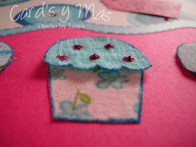 El cardstock fucsia es de Grabatto y el papel con círculos en tonos de azules me lo ha enviado Ledia, yo le puse luego un poco de glitter también fucsia. La tag es de Fotomemorias y esta teñida. Y la tela???? bueno les cuento que los cupcake están realizados con retacitos de tela endurecida para poder cortarla mejor sin que se deshilache y además queda con cuerpo, así pude pegar con cinta 3D la parte de arriba para que queda mas lindo, tambien le puse unos puntitos de glitter al cupcake del centro.