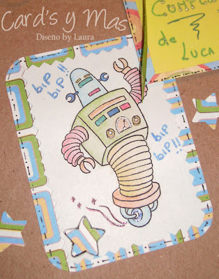 Esta hecha de cardstock color craft y tiene un dibujito de un robot que pinte con acuarelables y lapiceras gel, montado sobre papeles estampados que me envió Marcela desde Suiza. GRACIAS MARCE!!!!