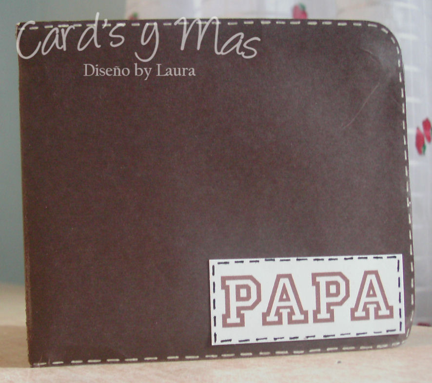 Imita una billetera, esta hecha con cardstock chocolate y papel rayado de Fotomemorias. Le puse unos cartelitos que imprimí con la compu y la foto de nuestros hijos. En el espacio que seria para colocar el dinero puse unos dibujitos que ellos le hicieron, menos del Toto que estaba empacado que no quería hacerle nada, jajaja